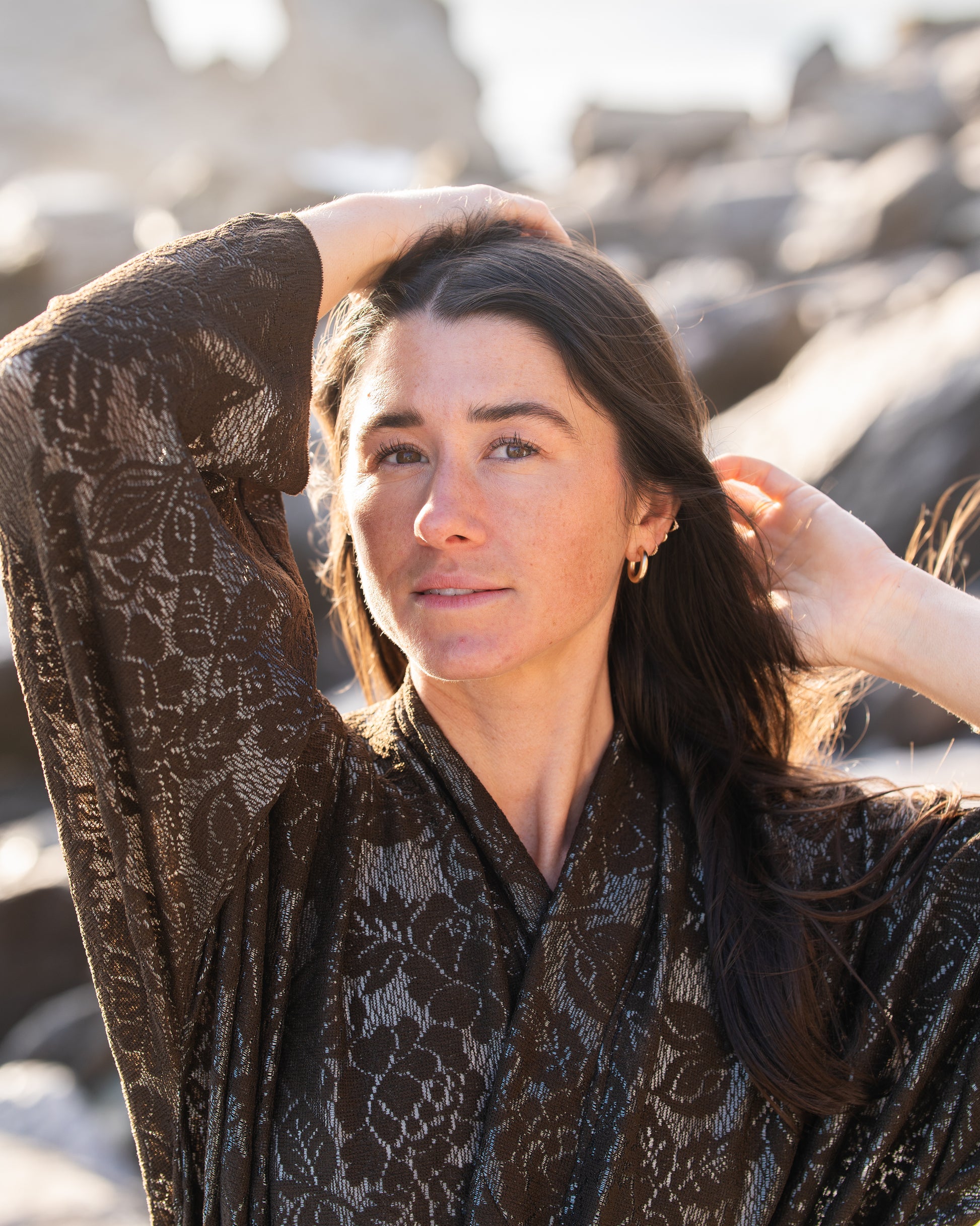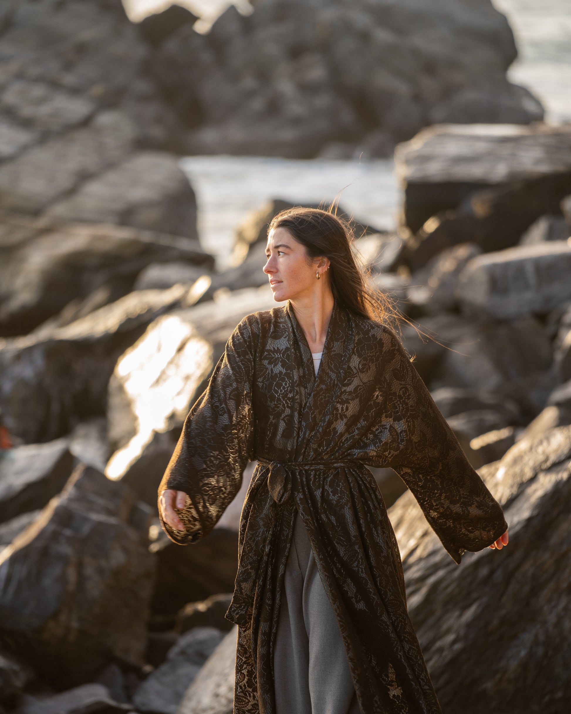 This robe has a stunning drape to it with a matching tie belt and lower calf length.